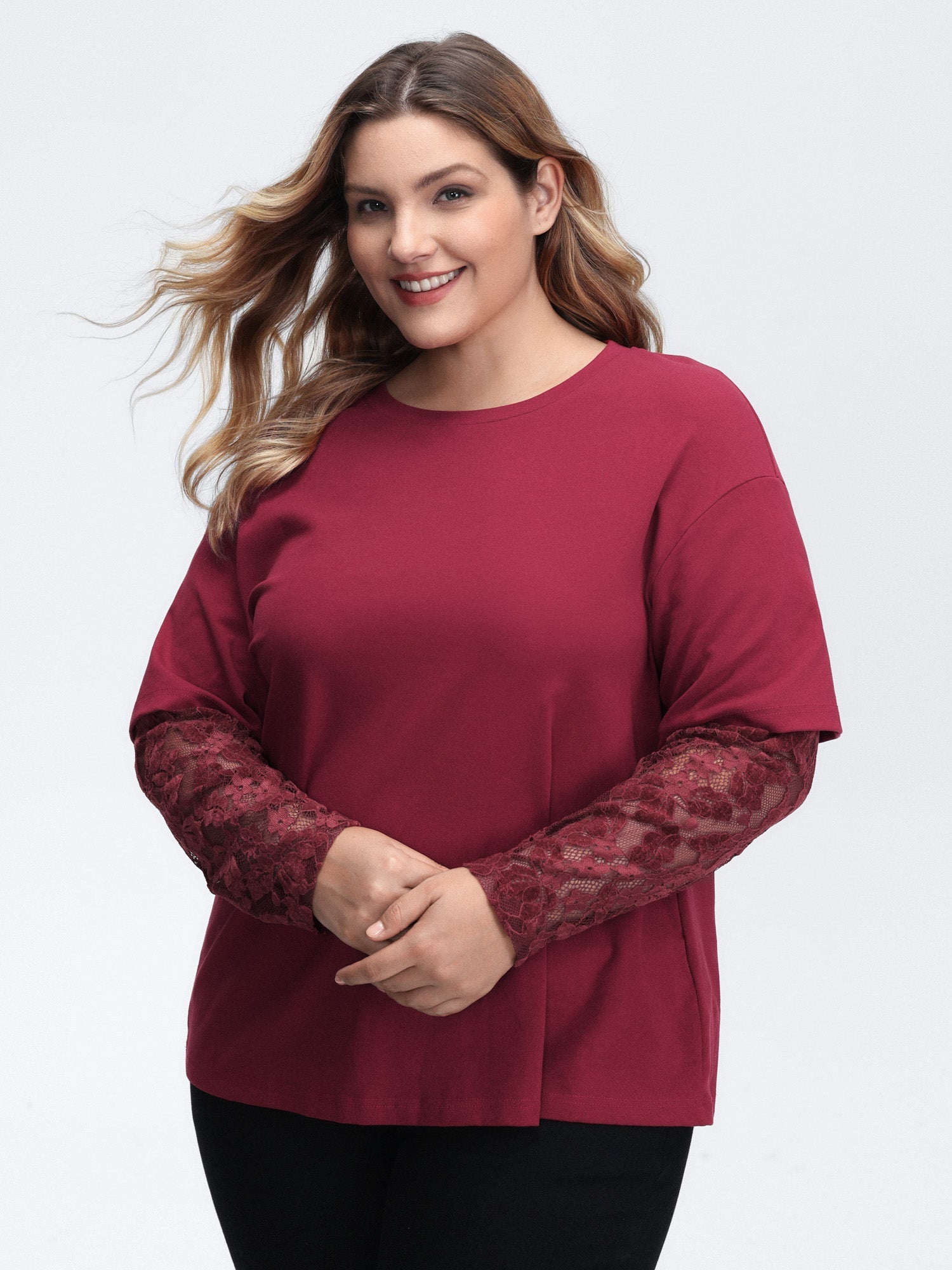 Shop 2-In-1 Layered Sheer Lace Sleeve T-Shirt now and redefine your style with confidence at BloomChic. Tailored for mid and plus-size women. This trendy Tops Women. sizes 10-30. Color:Scarlet;Prints:Non;Neckline:Round Neck;Sleeve Type:Drop shoulder sleeve;Pocket:No-pocket