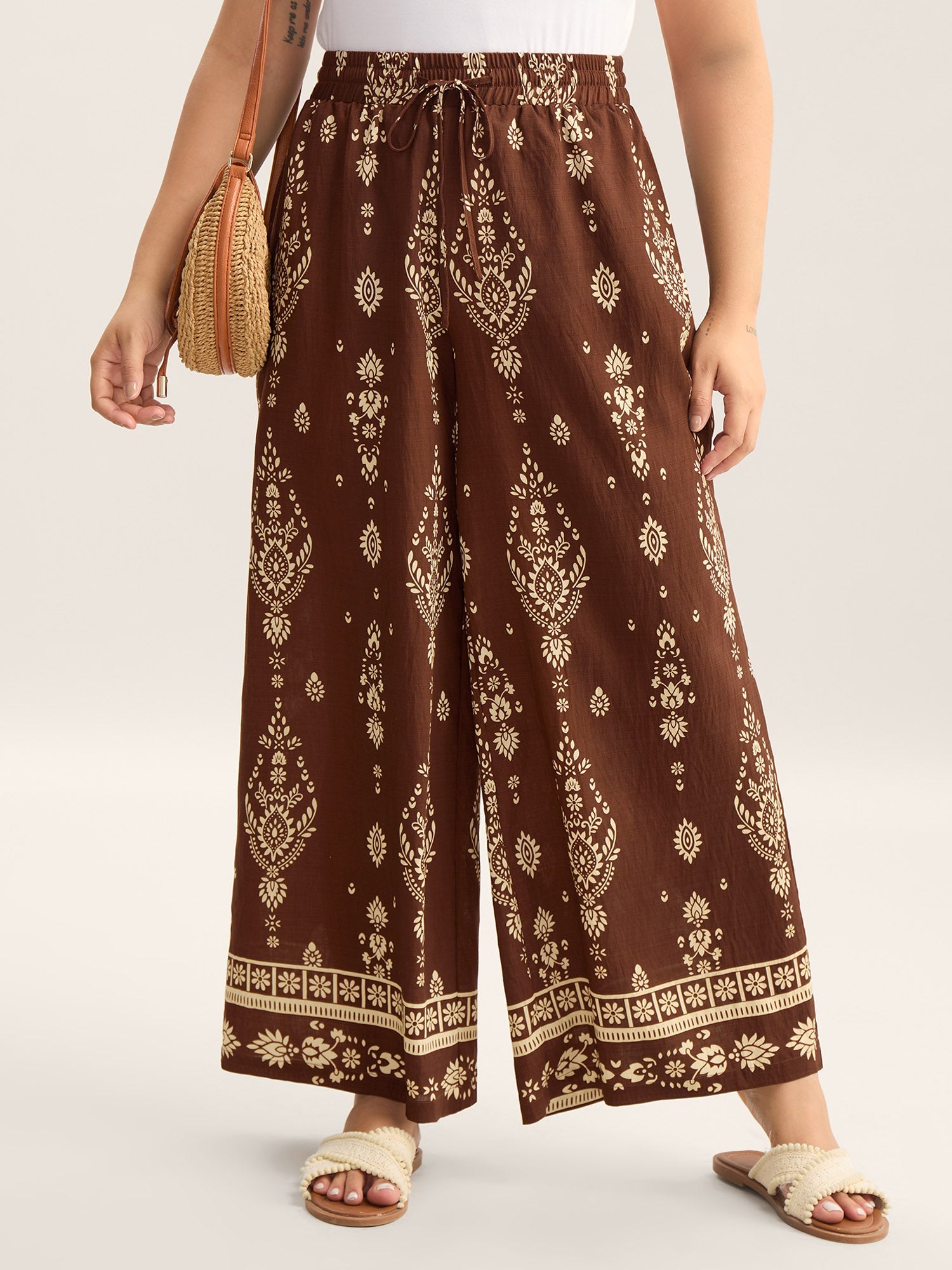 Shop Boho Print Drawstring Wide-Leg Pants now and redefine your style with confidence at BloomChic. Tailored for mid and plus-size women. This trendy Bottoms Women. sizes 10-30. Color:Browncoffeecolor;Style:Resort;Waist Design:Mid Rise;Prints:Bohemian print;Details:Drawstring;Pocket:Slanted pocket;Belt:No-belt;Closure Type:Non