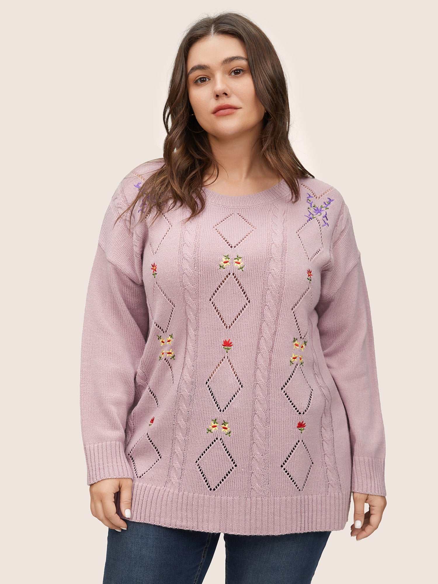 Shop Floral Embroidered Geometric Hollow Out Cable Knit Pullover now and redefine your style with confidence at BloomChic. Tailored for mid and plus-size women. This trendy Sweaters Cardigans Women. sizes 10-30. Season:Spring;Color:Lilac;Neckline:Round Neck;Sleeve Type:Regular Sleeve;Pattern Type:Geometric. Plain;Pocket:No-pocket;Belt:No-belt