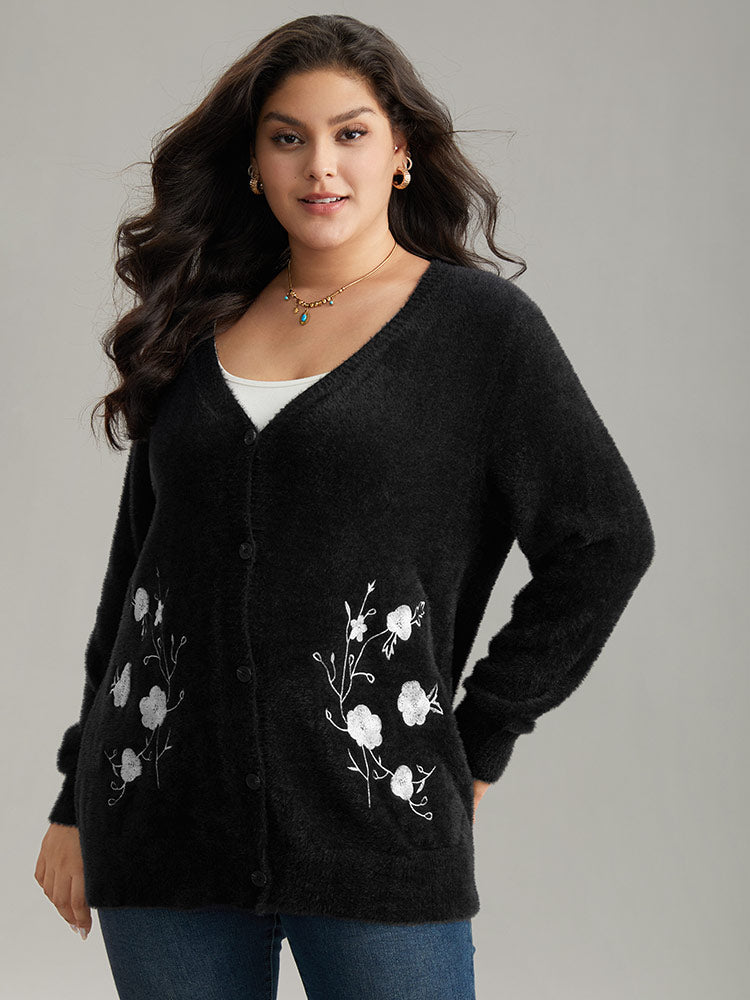 Shop Floral Embroidered Fuzzy Open Front Cardigan now and redefine your style with confidence at BloomChic. Tailored for mid and plus-size women. This trendy Sweaters Cardigans Women. sizes 10-30. Season:Winter;Color:Black;Neckline:Open Front;Sleeve Type:Regular Sleeve;Pattern Type:Natural Flowers;Details:Embroidered. Elastic cuffs;Pocket:No-pocket;Belt:No-belt