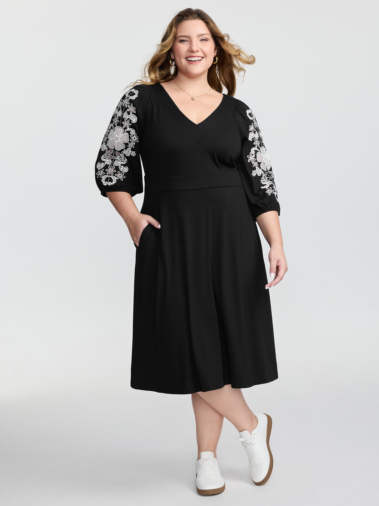 Shop Floral Embroidered V-Neck Pockets Midi Dress now and redefine your style with confidence at BloomChic. Tailored for mid and plus-size women. This trendy Dress. sizes 10-30. You can never go wrong with BloomChic Dresses. Color:Black;Neckline:V-neck;Sleeve Type:Raglan sleeve;Prints:Non;Details:Embroidered;Pocket:Side seam pocket;Belt:No-belt;Closure Type:Non