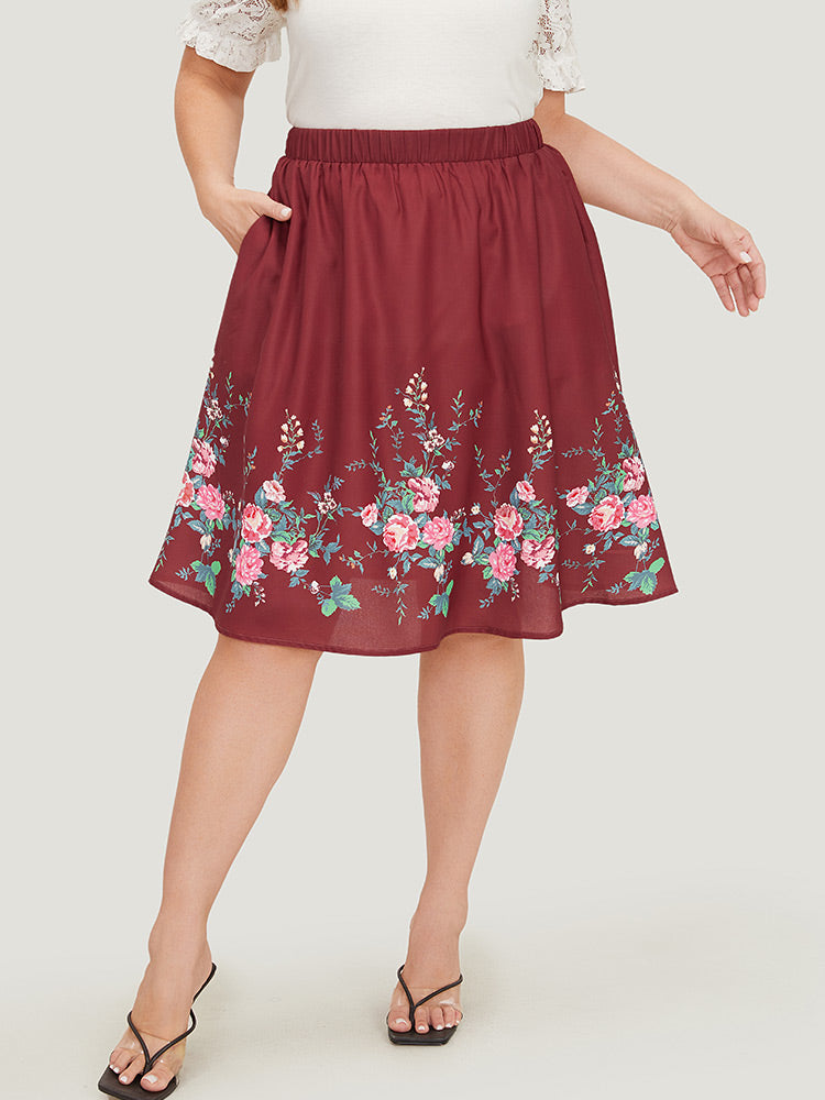 Shop Floral Print Pocket Flutter Hem Skirt now and redefine your style with confidence at BloomChic. Tailored for mid and plus-size women. This trendy Bottoms Women. sizes 10-30. Season:Summer;Color:Burgundy;Style:Elegant;Pattern Type:Floral;Details:Printed;Pocket:It is perfectly sized to carry a phone.;Belt:No-belt;Closure Type:Elastic Waist