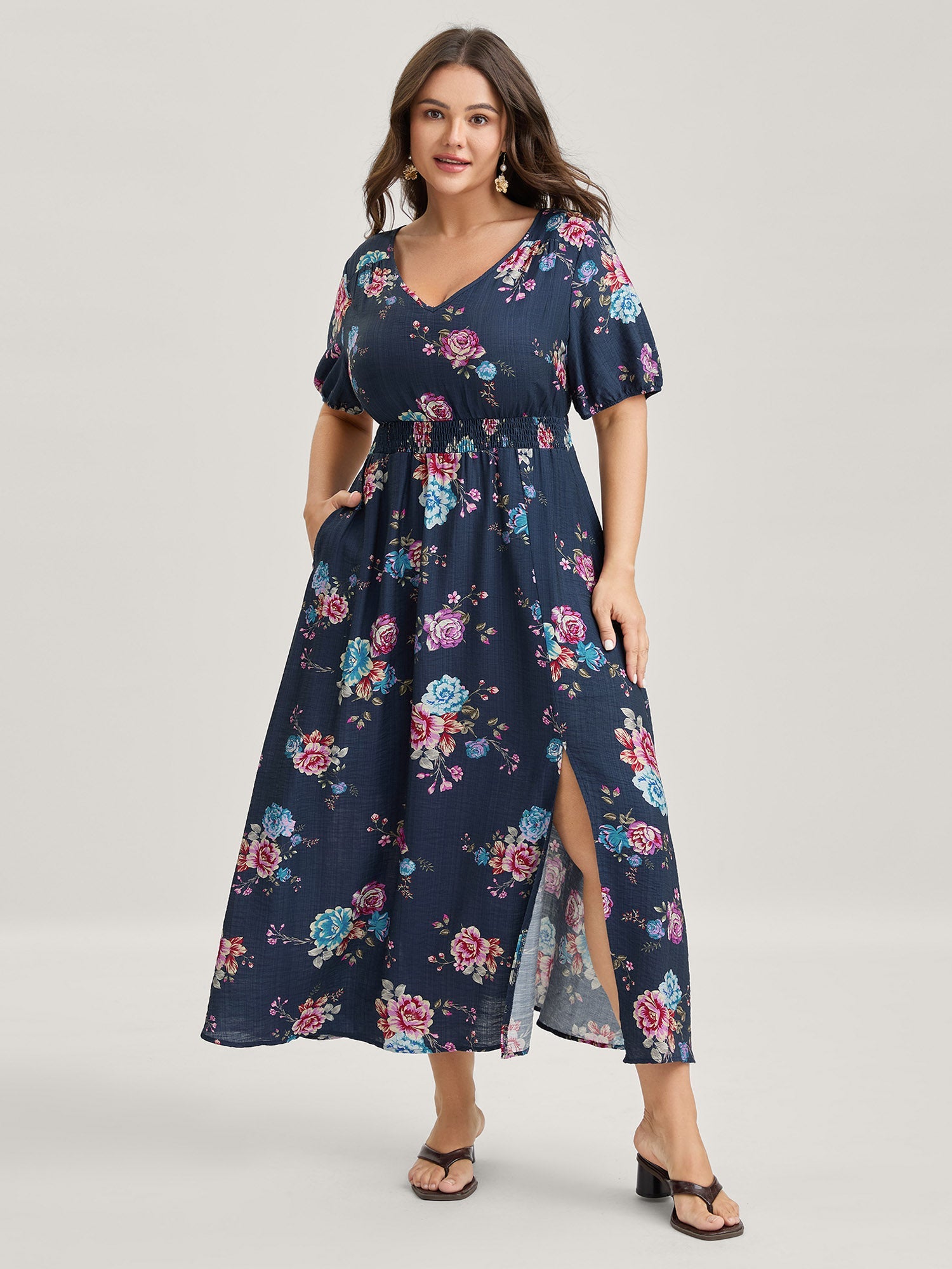 Shop Floral Print Shirred Waist Slit Midi Dress now and redefine your style with confidence at BloomChic. Tailored for mid and plus-size women. This trendy Dress. sizes 10-30. You can never go wrong with BloomChic Dresses. Color:DarkBlue;Neckline:V-neck;Sleeve Type:Lantern Sleeve;Prints:Floral;Details:Shirred. Slit;Pocket:Side seam pocket;Belt:No-belt;Closure Type:Non