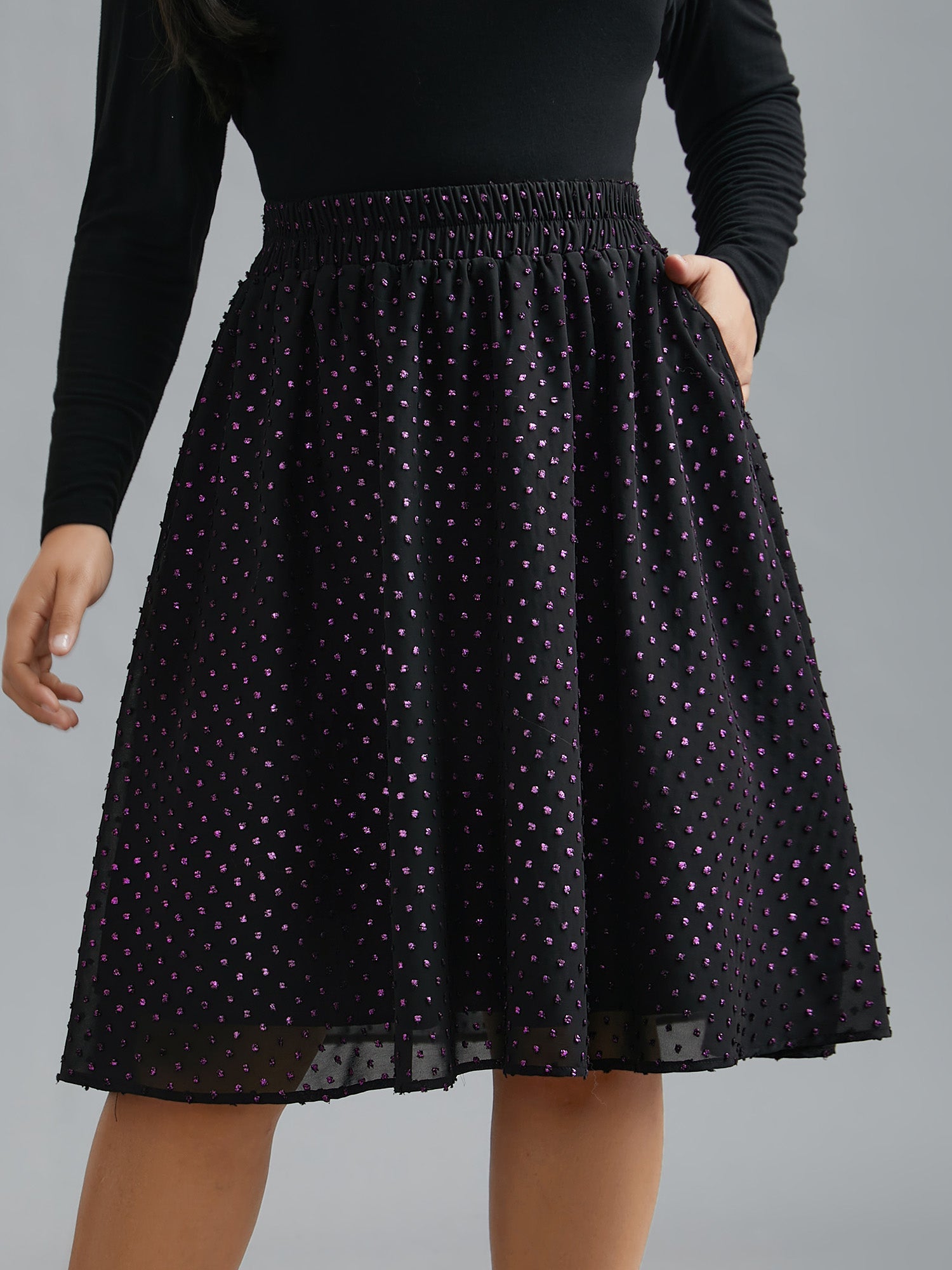 Shop Glitter Polka Dot Pleated Skirt now and redefine your style with confidence at BloomChic. Tailored for mid and plus-size women. This trendy Bottoms Women. sizes 10-30. Season:Winter;Color:Black;Style:Elegant Everyday;Prints:Polka dots;Details:Gathered;Pocket:Side seam pocket;Belt:No-belt;Closure Type:Non