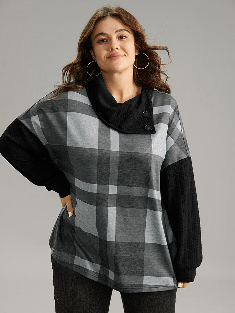 Shop Plaid Patchwork Mock Neck Button Detail Sweatshirt now and redefine your style with confidence at BloomChic. Tailored for mid and plus-size women. This trendy Tops Women. sizes 10-30. Season:Winter;Color:Black;Style:Casual;Neckline:Mock Neck;Sleeve Type:Regular Sleeve;Pattern Type:Plaid;Details:Button. Patchwork. Contrast;Pocket:No-pocket;Belt:No-belt