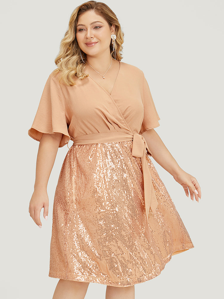 Shop Sequin Patchwork Pocket Belted Surplice Neck Ruffle Dress now and redefine your style with confidence at BloomChic. Tailored for mid and plus-size women. This trendy Dress. sizes 10-30. You can never go wrong with BloomChic Dresses. Season:Summer;Color:Apricot;Style:Party;Neckline:V-neck;Sleeve Type:Ruffle Sleeve;Pattern Type:Plain;Details:Pocket. Belted. Wrap. Lined;Pocket:It is perfectly sized to carry a phone.;Belt:Belt