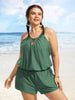 Solid Keyhole Elastic Waist Gathered One Piece Swimsuit