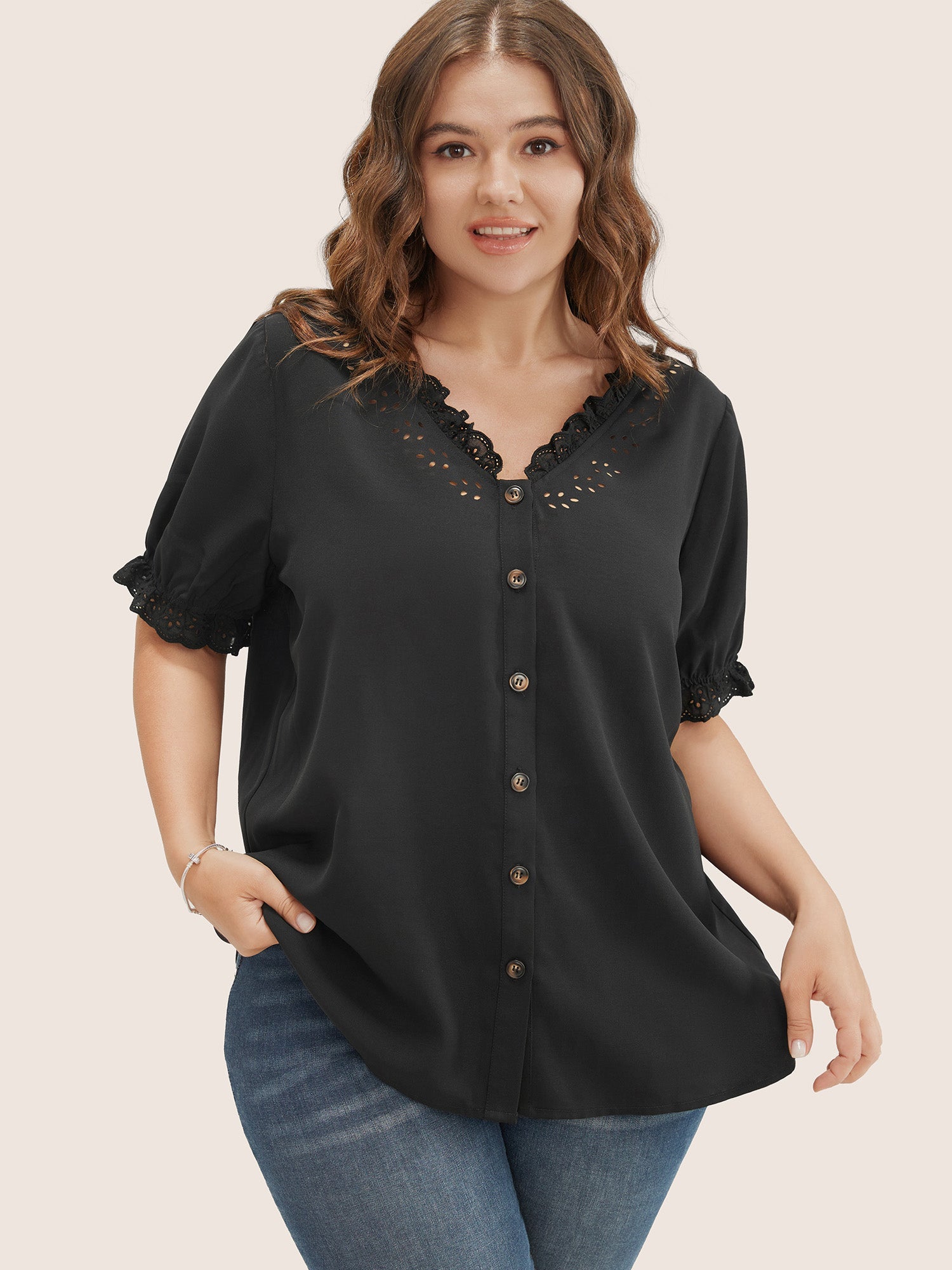 Shop Solid Lace Trim Button Up Laser Cut Puff Sleeve Blouse now and redefine your style with confidence at BloomChic. Tailored for mid and plus-size women. This trendy Tops Women. sizes 10-30. Color:Black;Pattern Type:Plain;Neckline:V-neck;Sleeve Type:Puff Sleeve;Pocket:No-pocket